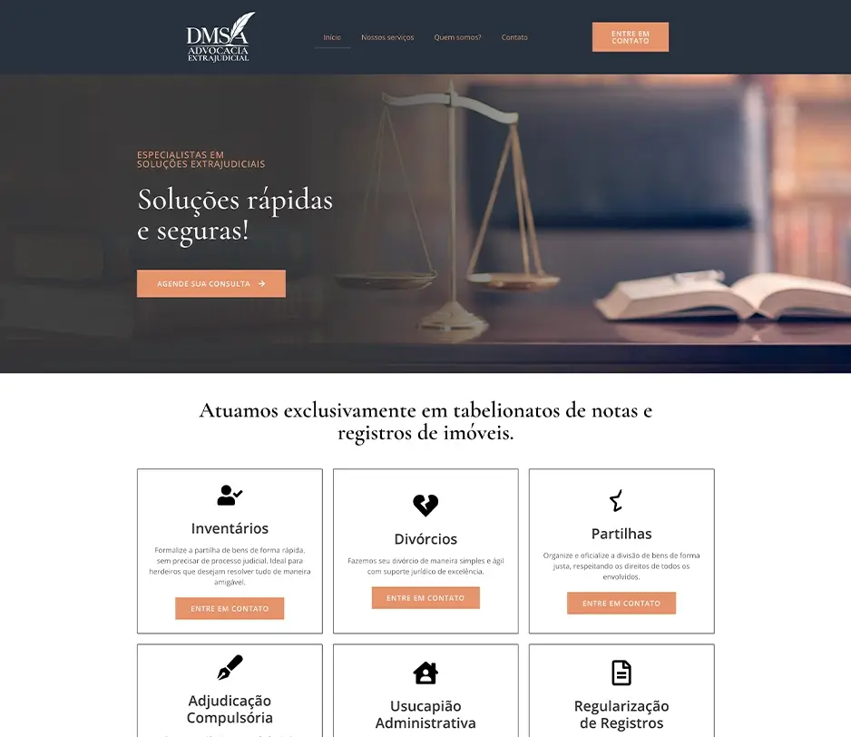 Site oficial da DMSA, focado em destacar a atuação jurídica extrajudicial, transmitir confiança e facilitar o acesso às soluções oferecidas pelo escritório.