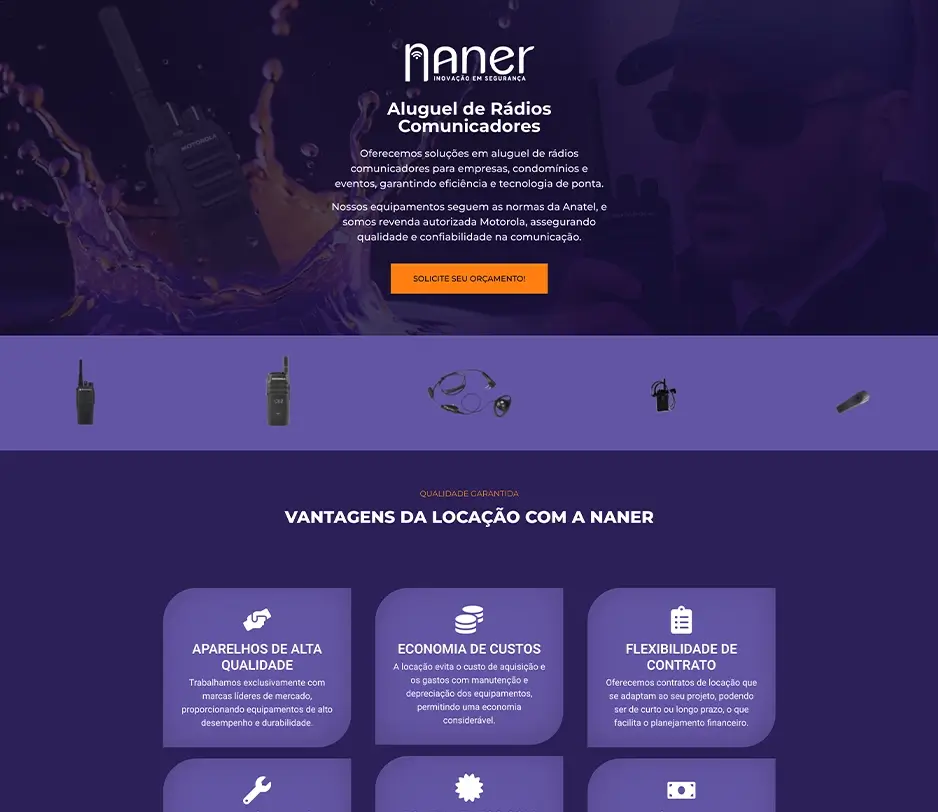 Landing page desenvolvida para apresentar as soluções em rádio comunicação da Naner em segurança, com foco em clareza, impacto visual e conversão de novos clientes.
